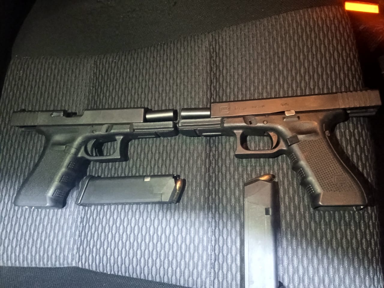Al revisar el vehículo se encontró en medio de la palanca y el asiento otra pistola calibre 9 milímetros, por lo que se les cuestionó si eran personal del ejército o contaban con permisos de portación de arma de fuego, sin que dieran una respuesta afirmativa.