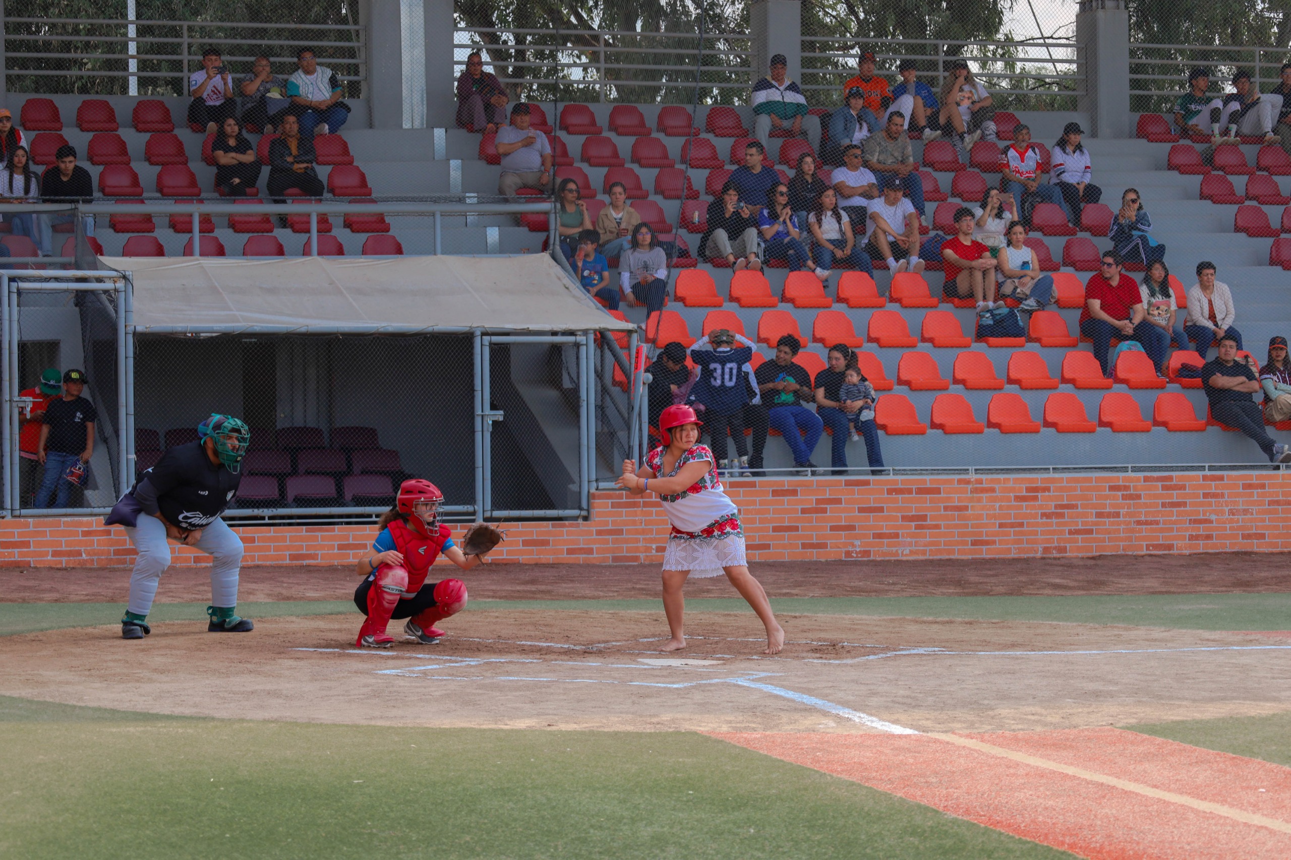 Así el equipo de las mujeres mayas, con su traje tradicional bordado con alegres flores, sin zapatos y hasta con el niño en brazos vistieron de color el diamante en este partido amistoso.